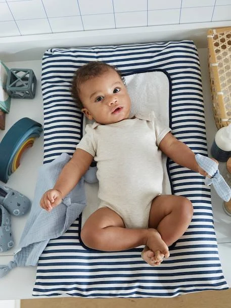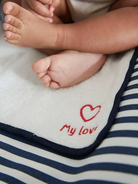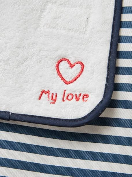 Un matelas à langer bien moelleux et rempli de tendresse pour le change de votre bébé. Sa rayure marine indémodable et son petit message “my love” brodé sur la serviette promettent un change tout en douceur.