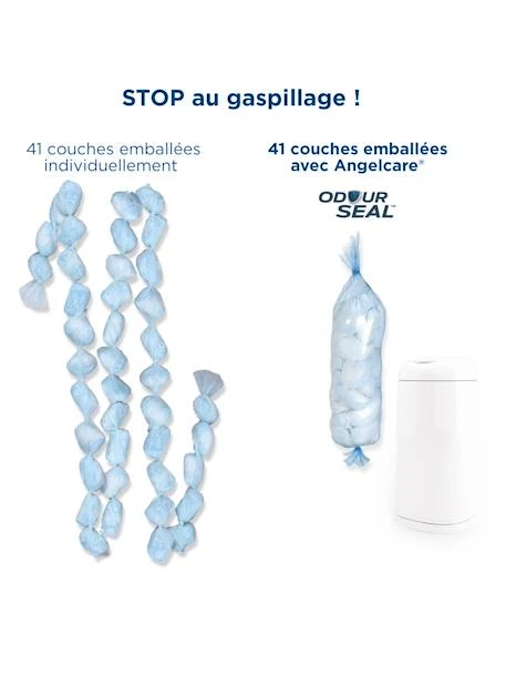 Avec la poubelle à couches Dress Up Angelcare, fini les mauvaises odeurs ! La technologie OdourSeal™ Angelcare est 5 fois plus efficace que les autres poubelles à couches pour emprisonner les mauvaises odeurs. Economique, la Dress Up Angelcare peut contenir jusqu’à 41 couches de taille 1 ! Ergonomique, elle s’utilise d’une seule main : poussez, la couche est isolée ! Facile à vider, sa lame sécurisée vous permet de couper le film de la recharge en toute simplicité. 5 fois plus efficace contre les odeurs grâce à son film plus épais.